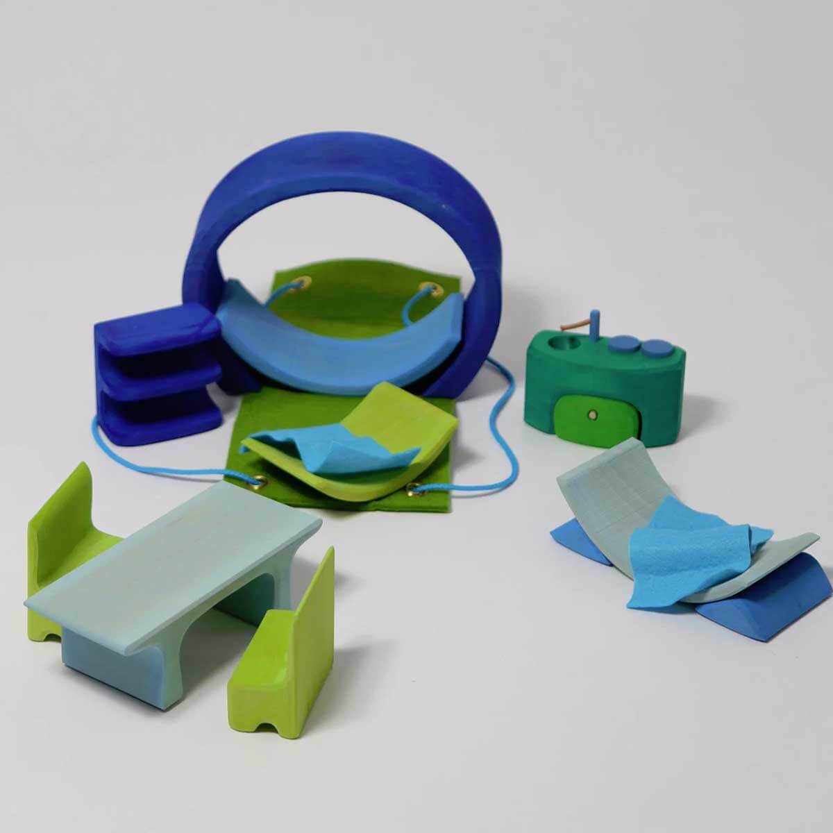 Mit 12 hochwertig gefertigten Holzelementen – darunter Dach, Bögen, Küchenzeile, Tisch, Stühle, Hocker und Regal – sowie zwei Filztüchern bietet es vielfältige Kombinationsmöglichkeiten. Die Möbel lassen sich immer wieder neu arrangieren, sodass kreative Rollenspiele und wechselnde Erlebniswelten entstehen.