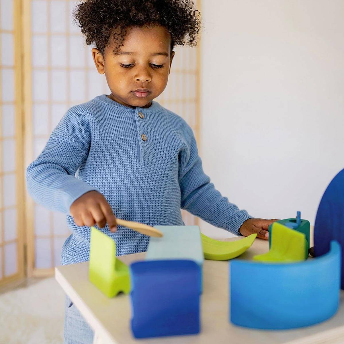 Das langlebige Holzspielzeug von GRIMM’S besticht durch sein reduziertes Design, das viel Raum für die kindliche Kreativität lässt. So entstehen immer wieder neue fantasievolle Spielwelten, die sich flexibel an die Entwicklung des Kindes anpassen.
