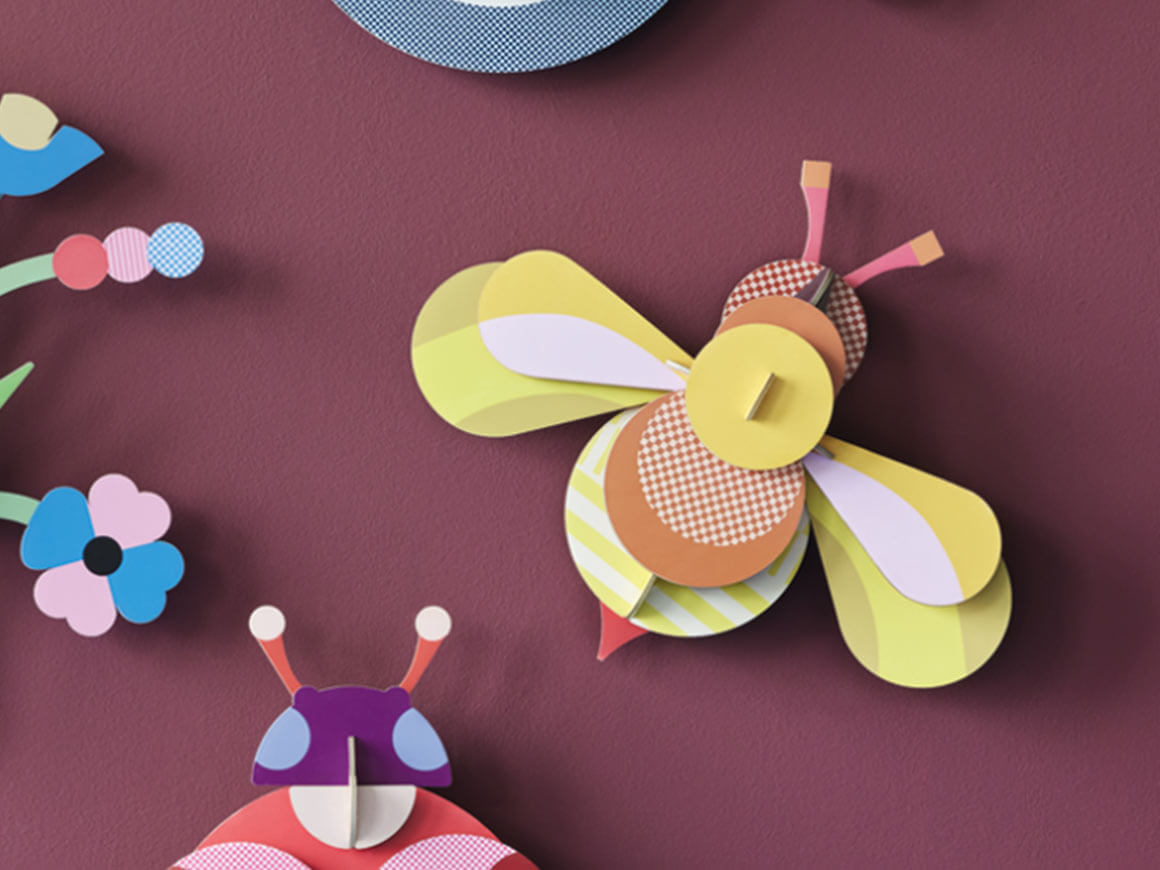 Die Candy Bee wirkt als einzelnes Wandobjekt ebenso dekorativ wie in Kombination mit weiteren Designs von Zoë Miller und setzt kreative Akzente im Kinderzimmer, Babyzimmer oder modernen Wohnbereich.