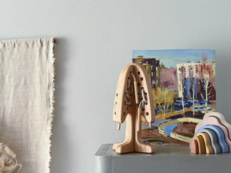 Hergestellt aus massivem Eschenholz und lediglich mit pflanzlichem Wachs behandelt, präsentiert sich die „Fädelbirke“ von Lotes Toys in ihrer natürlichen Schönheit. Die Struktur des Materials erlaubt ein angenehmes Experimentieren.