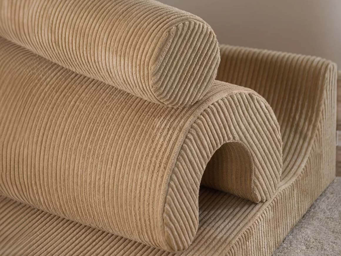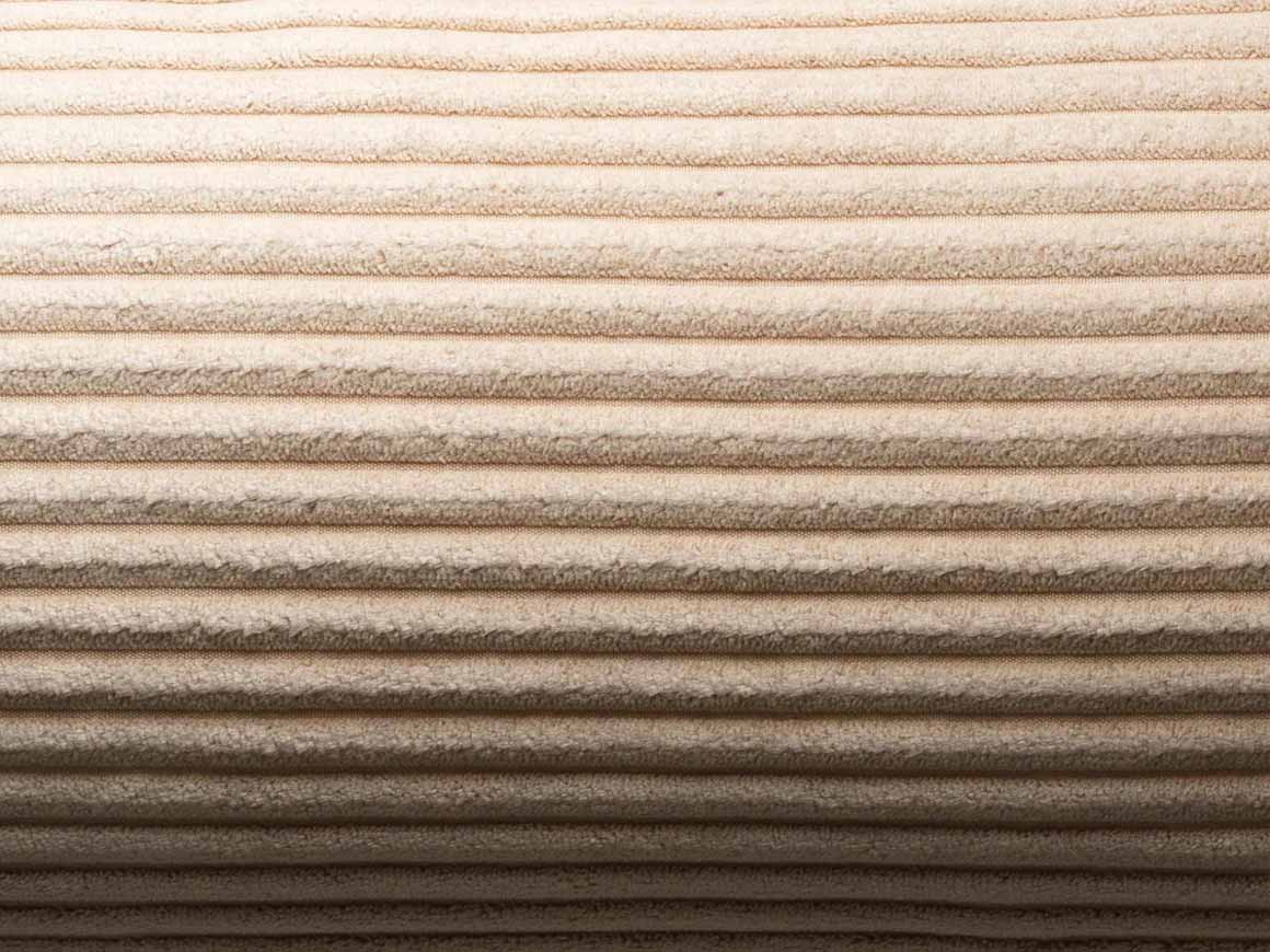 Der weiche Außenbezug besteht aus hochwertigem, OEKO-TEX® und GRS® zertifiziertem Breitcord aus recycelten PET-Flaschen und überzeugt durch seine angenehme Haptik sowie Langlebigkeit. Der Bezug ist mit einem Reißverschluss ausgestattet, lässt sich einfach abnehmen und kann bei 30 °C gewaschen werden, was die Pflege besonders unkompliziert macht.