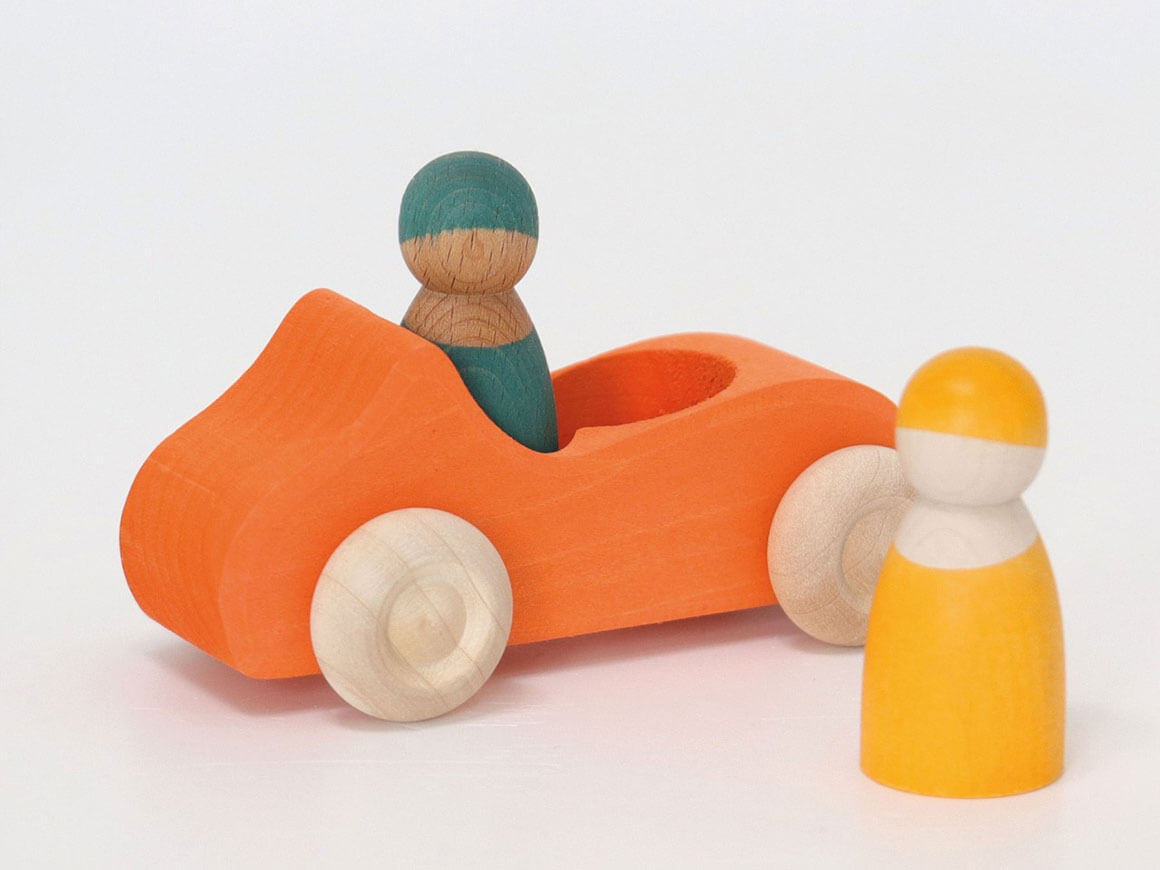 Das Große Cabrio Orange von GRIMM’S besticht durch seine schlichte und geländegängige Form. Es bietet Platz für zwei Holzmännchen, die mit auf eine Spritztour ins Grüne gehen können. Nach der Fahrt müssen die Fahrzeuge nicht in die Waschstraße, sondern können ganz einfach mit einem feuchten Lappen gereinigt werden.