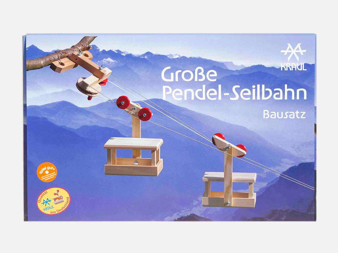 Der Bausatz Große Pendelseilbahn fährt quer durch das Zimmer oder in den Garten hinunter. Sie wird dabei mit dem Zugseil vorsichtig gezogen oder saust in freier Fahrt zu Tal. Puppen und Bauklötze dürfen mitfahren.
