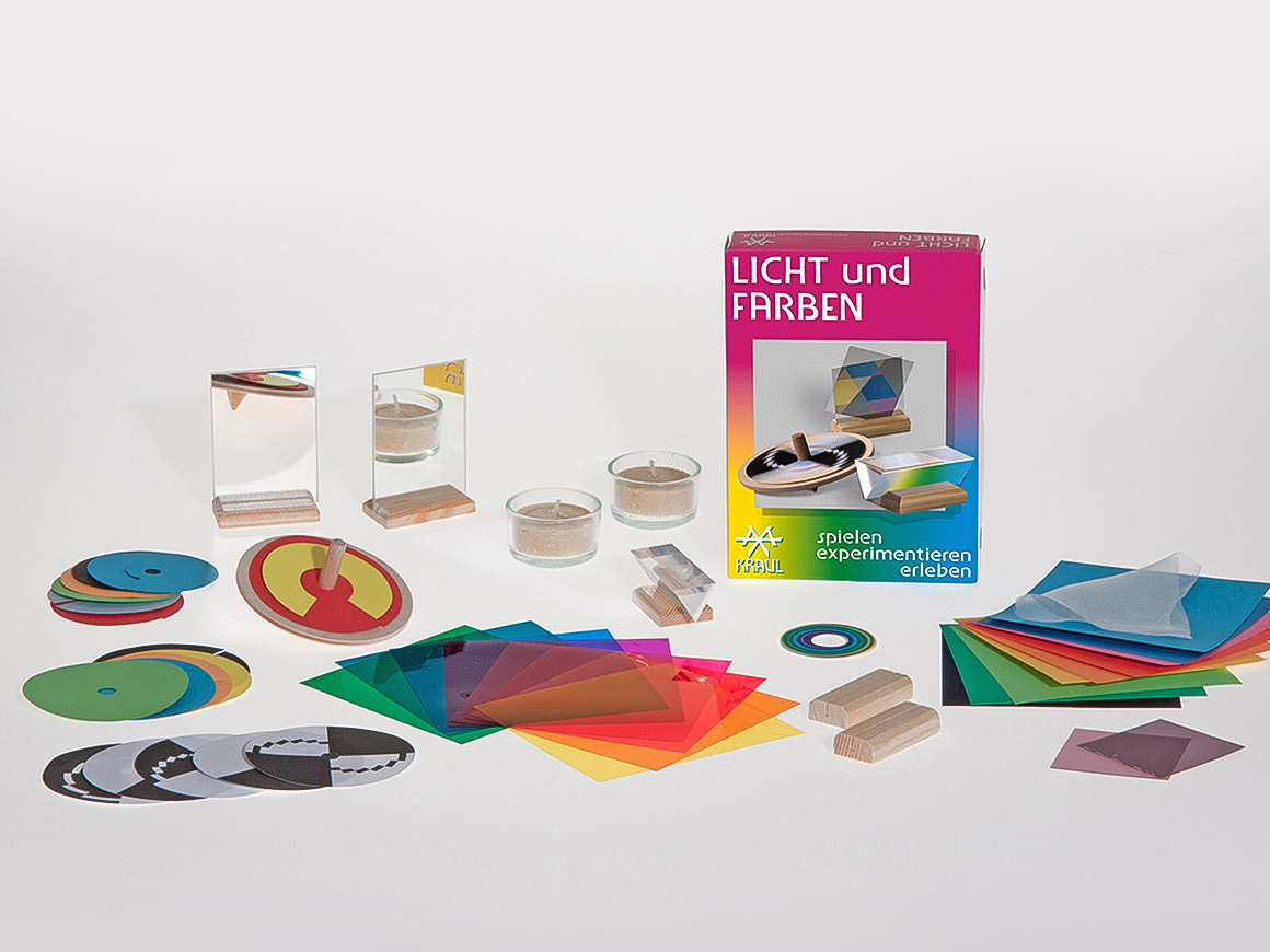 Der Experimentierkasten LICHT UND FARBEN von KRAUL regt mit ausführlicher Anleitung zu sehr vielen verschiedenen Versuchen und Beobachtungen an.