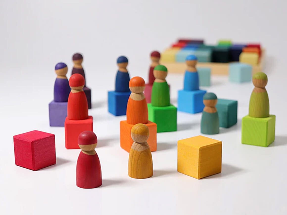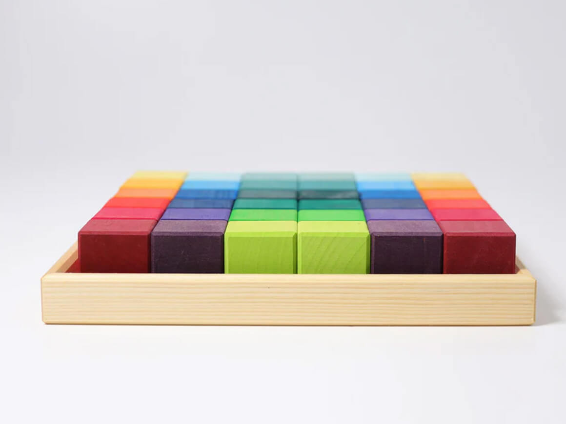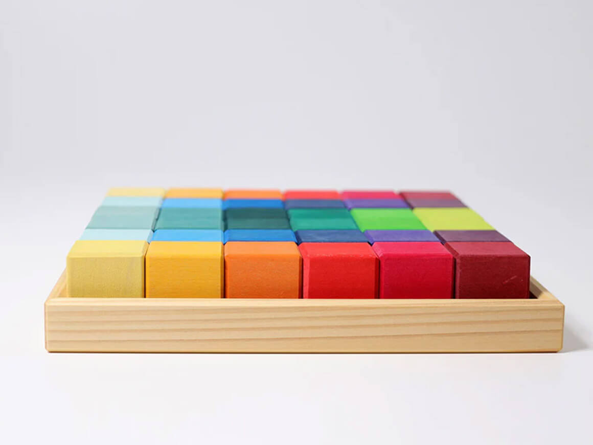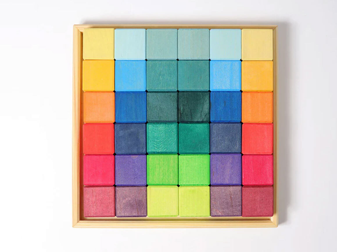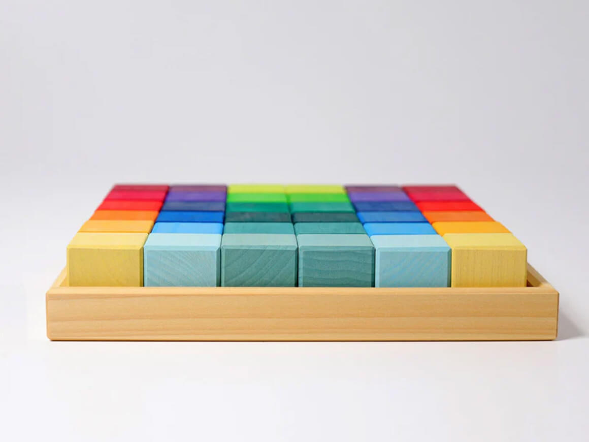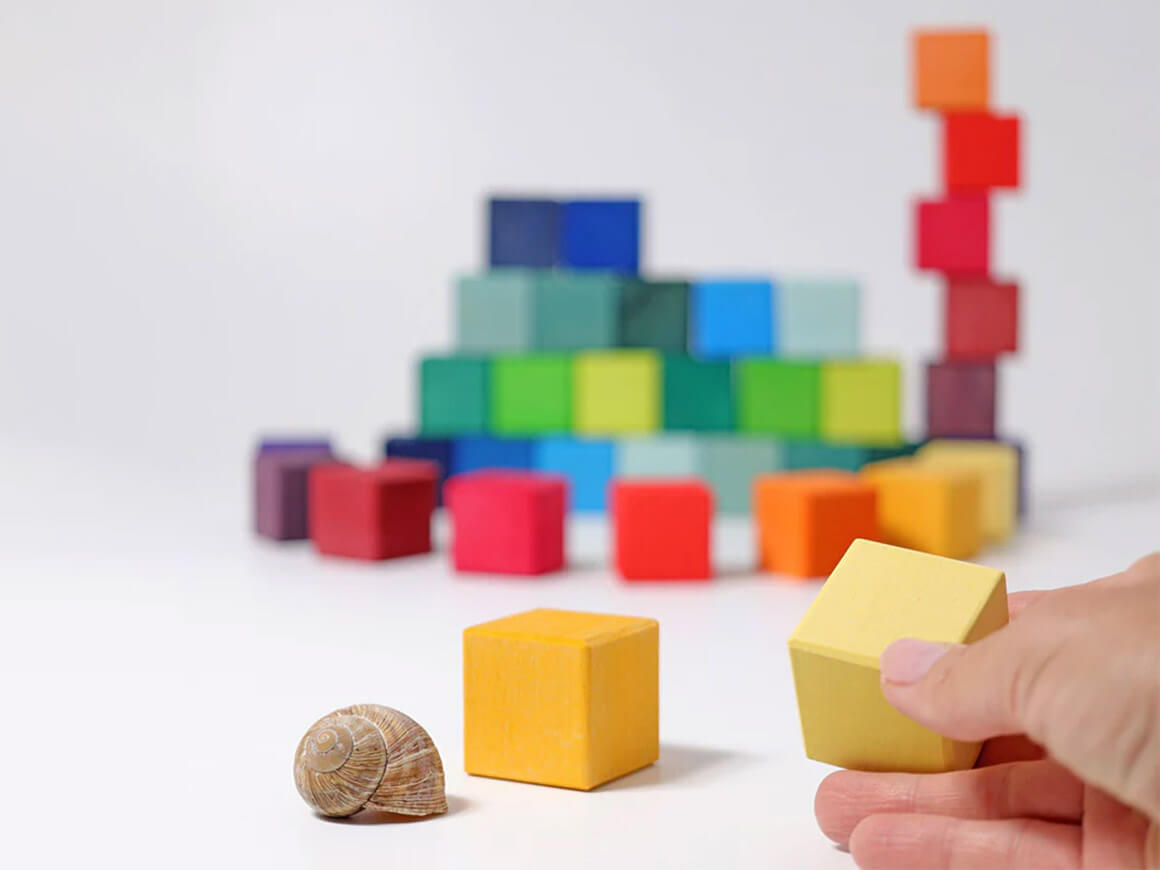 Das Regenbogen Mosaik von GRIMM’S besteht aus der elementaren Würfelform, die Kindern als vielseitiger Bauklotz dient. Mit den farbenfrohen Klötzen lassen sich einfache Bauwerke wie Mauern, Türme und Burgen gestalten, ebenso Häuschen, Zäune oder Ställe. Auch das Nachbauen von Inventar wie Tischen und Stühlen ist möglich.
