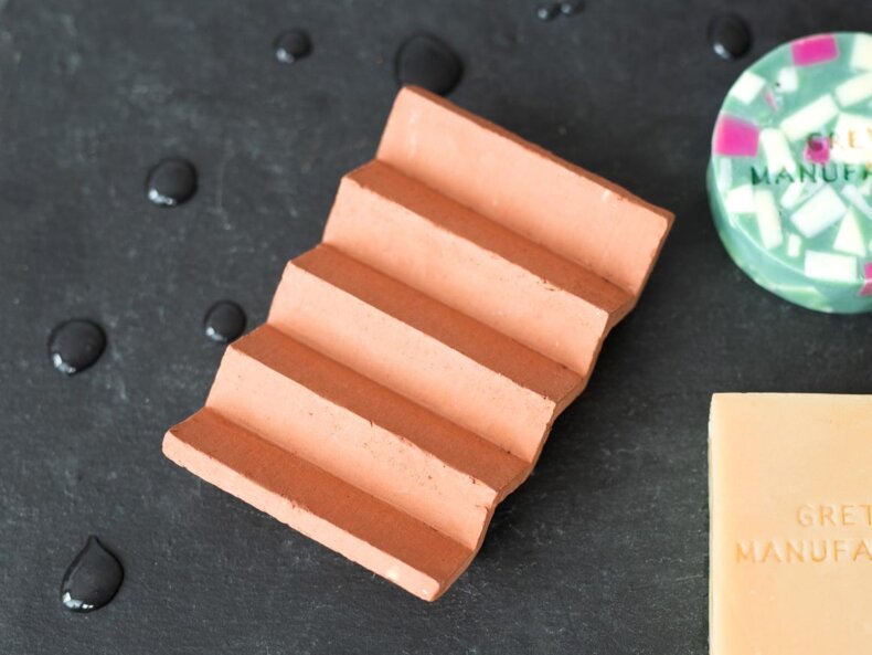 Jede Ablage erhält durch das zweifache Brennen bei 1.400 Grad Celsius wasserabweisende Oberfläche, die zusammen mit der Zickzack-Optik der Seifenablage ihre besondere Ästhetik verleiht.