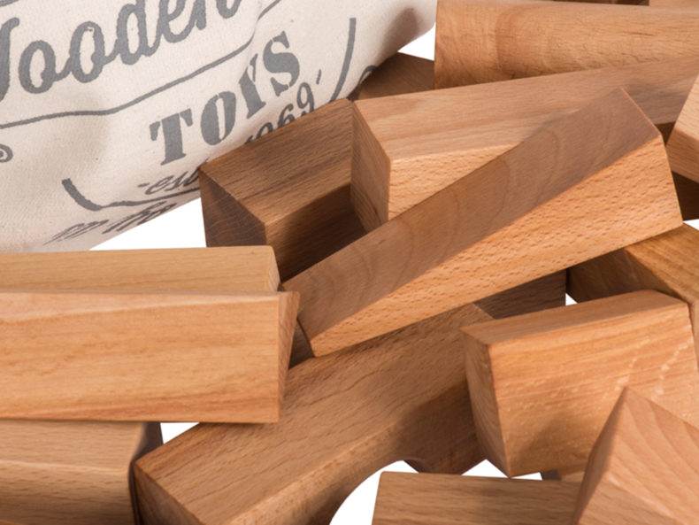 Die Bausteine fallen durch ihre natürliche Farbe und ihren herrlichen Geruch nach Holz auf.