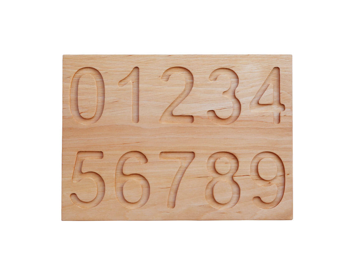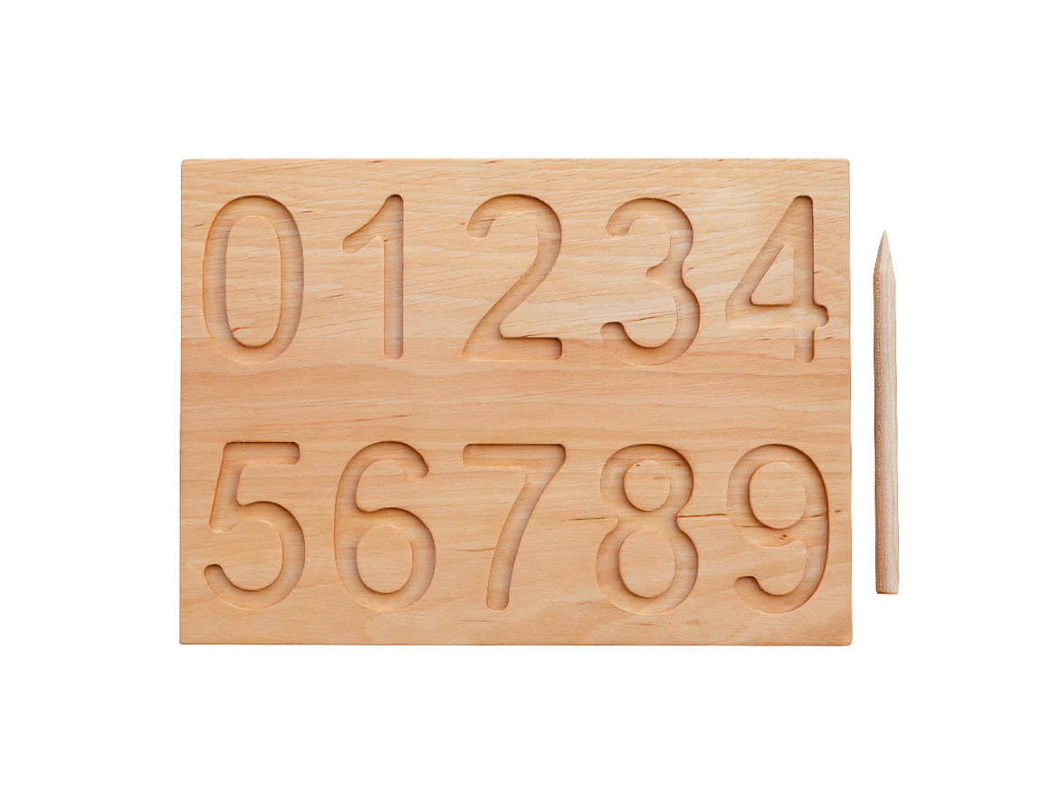 Eine Seite des Zählbrettes lehrt das Schreiben von Zahlen und entwickelt die Feinmotorik. Es wird gezeigt, wie man Zahlen mit dem Finger oder einem Holzstift schreiben kann. Auf diese Weise lernt das Kind, den Stift richtig zu halten und übt, die für das Schreibenlernen notwendigen Handbewegungen. Auf der anderen Seite des Brettes sind Zahlen mit der entsprechenden Anzahl von Holzkugeln abgebildet.